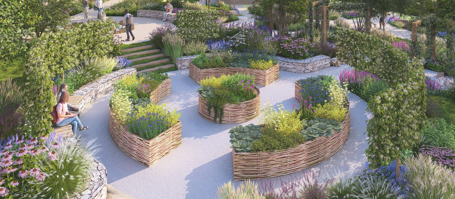 The new garden will replace an existing car park for people working at Oxygen house. The garden will provide space for work, growing food, exercise and rest using principles of permaculture for its creation and long-term management. The regenerative led design includes re-using existing site materials, permeable surfaces, minimal concrete use, reclaimed timber for furniture and gabion walls and extensive habitat creation to support a more natural ecosystem.